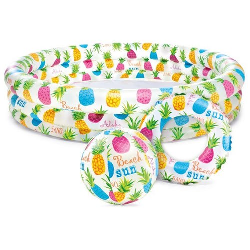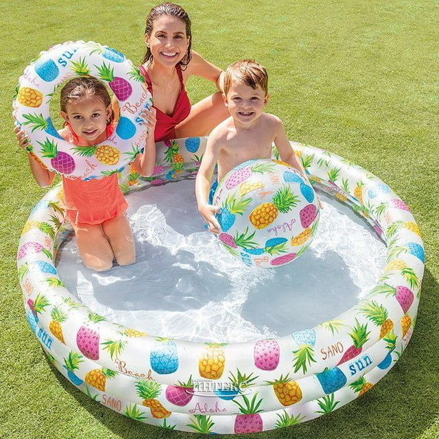 Детский надувной бассейн небольшой глубины отлично подойдет для купания вашего малыша в жаркий летний день. В комплект входит надувной круг и надувной мяч.
