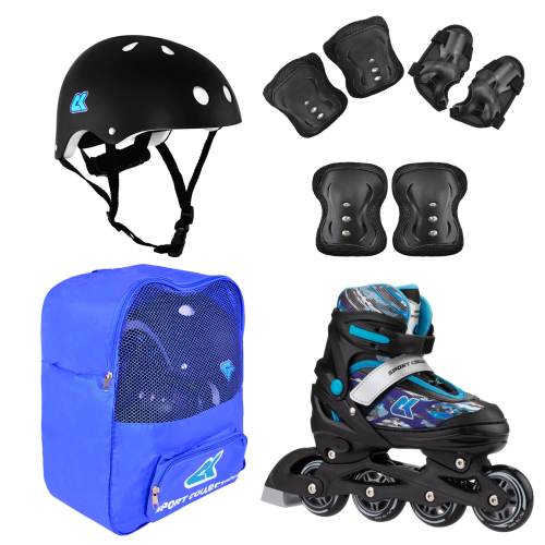 В комплект входит: Раздвижные роликовые коньки, шлем, защита.